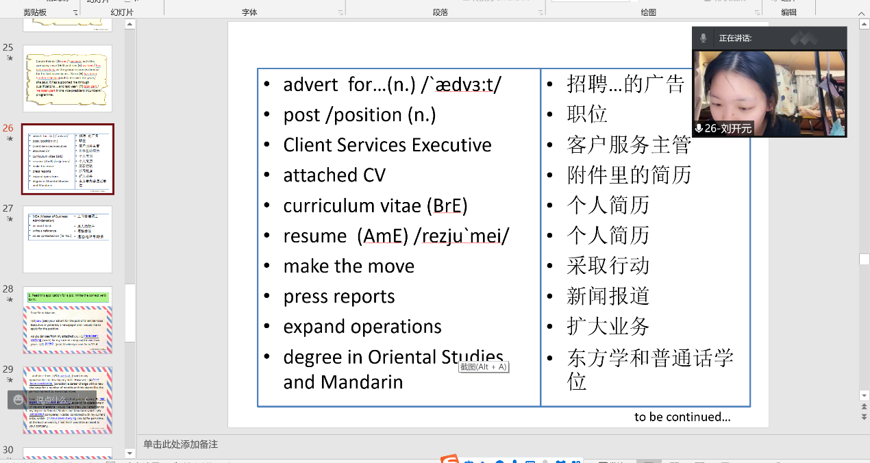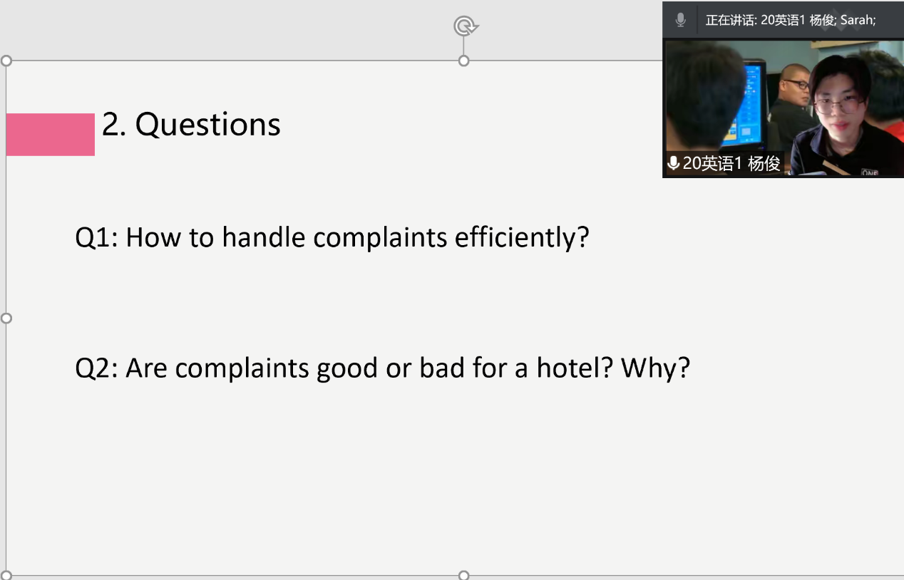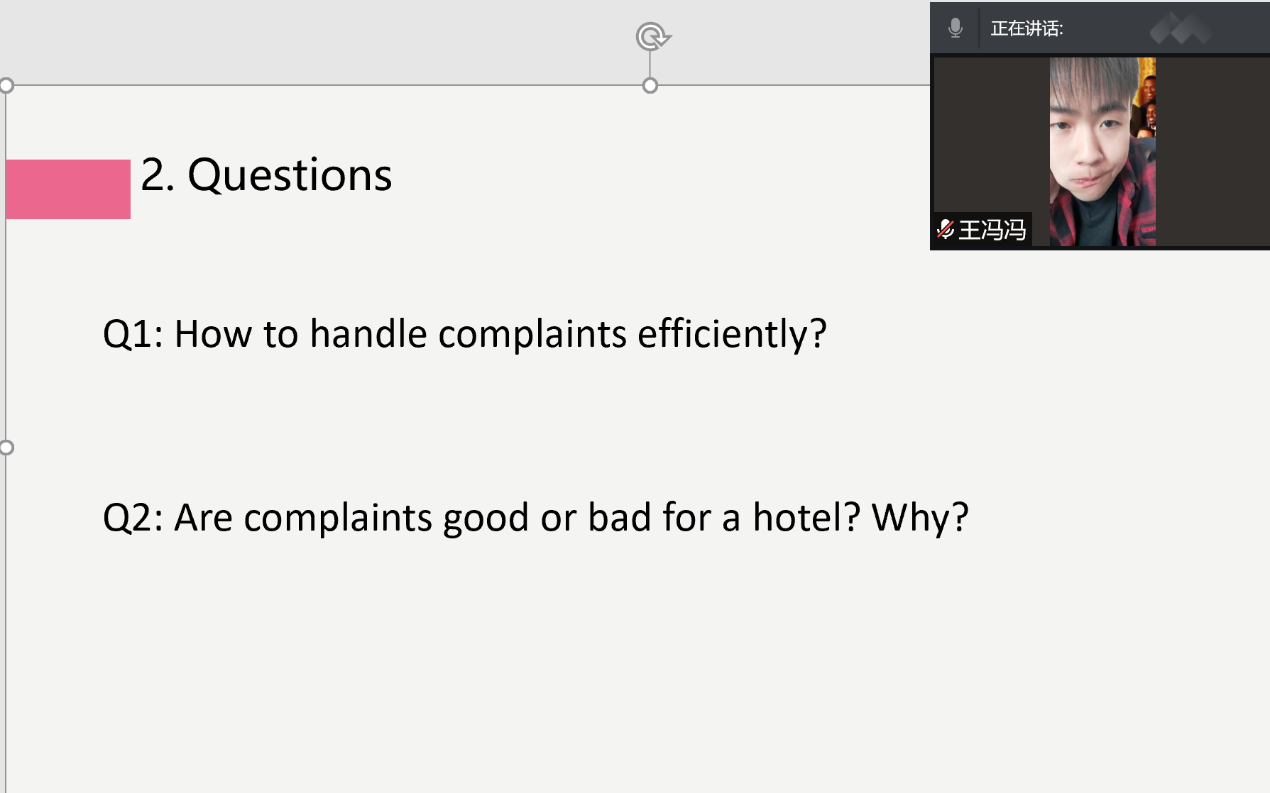 “作为一名专任教师,我边摸索,边改进,不断提升自己的网络教学能力,课前调试好线上教学所需的相关技术工具,保证网络学习环境畅通,确保在线学习环境健康、网络安全通畅;同时我根据教授班级的学习情况和所授课程酒店英语和BEC中级特点选择适当的线上授课形式,以学生为中心,重视任务驱动与问题探究形式的多样性,提供给学生教学相关视频和音频,以多样的教学形式切实提高线上课堂的高效性;课后我会给学生布置适量作业,以巩固学生当堂学习内容。通过和学生的积极互动,我的线上教学顺利进行,学生课堂反馈良好,课后作业按时提交,各项教学工作有条不紊开展,互联网+的线上教学模式顺利开展。”