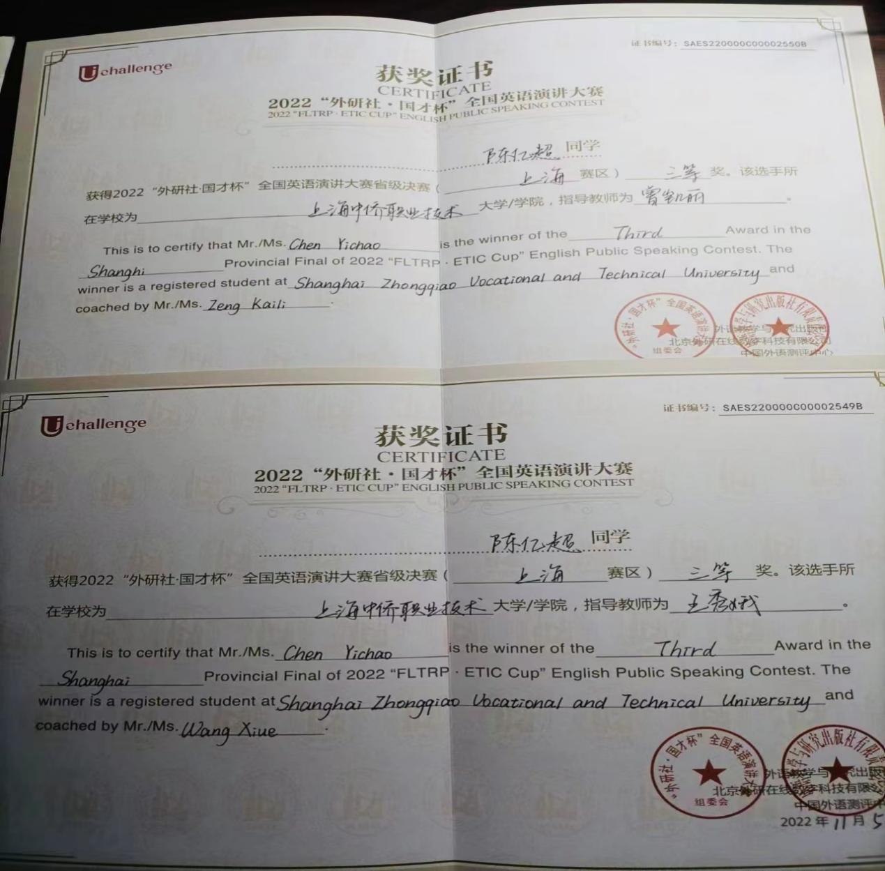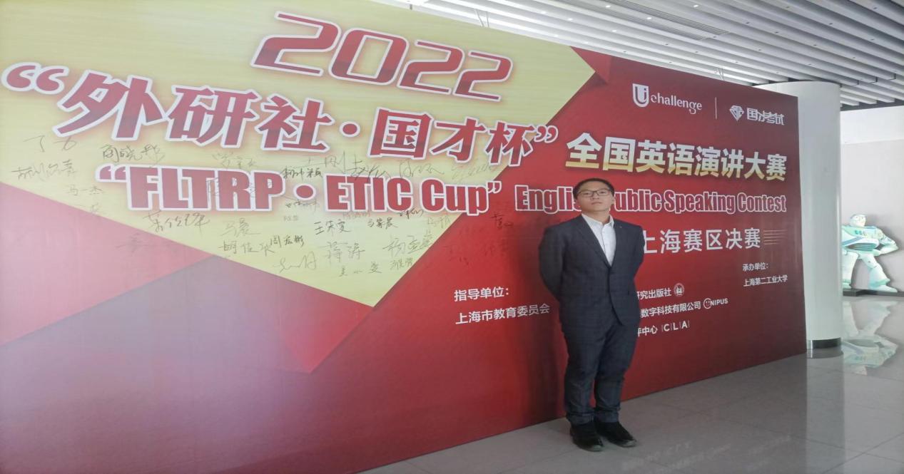 The Shanghai Provincial Final of the "2022 FLTRP·ETIC Cup" English Public Speaking Contest (undergraduate group) came to a triumphant end on November 6th in the Shanghai Second Institute of Technology University. The contest was co-sponsored by Foreign Language Teaching and Research Press and China Foreign Language and Education Research Center. The outstanding contestants from 30 undergraduate universities in the city gave full, vivid and wonderful speeches on the stage. Chen Yichao, a class of 20th grade Engineering program of our university, won the third prize with his confidence and strength. His instructors were Ms. Zeng Kaili and Mrs. Wang Xiu'e.