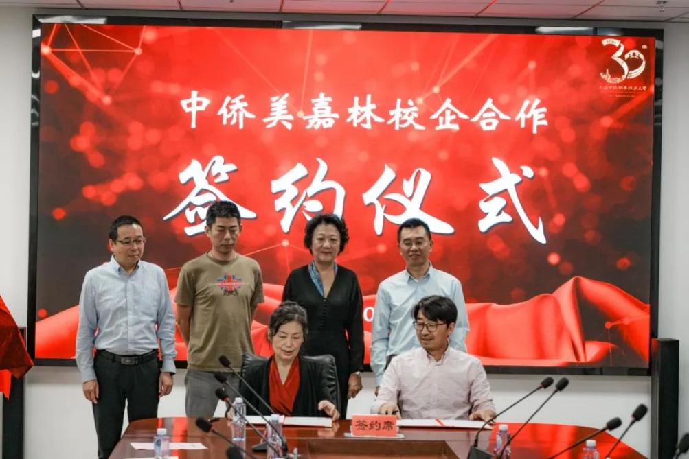 仪式最后,刘淑芸副校长与金勇华总经理共同为“中侨美嘉林技术传播产教创新基地”落成揭牌。李梅院长与邵文佳副总经理签署校企合作框架协议。