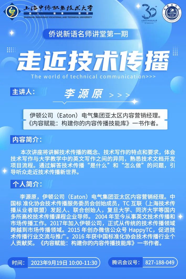 讲座的主讲人李源原先生作为伊顿公司(Eaton)电气集团亚太区内容营销经理,同时也是中国标准化协会技术传播服务委员会创始成员,TC 互联(上海技术传播从业者联盟)发起人、联合创始人,在复旦大学、同济大学等国内多所高校任技术传播课程企业导师。