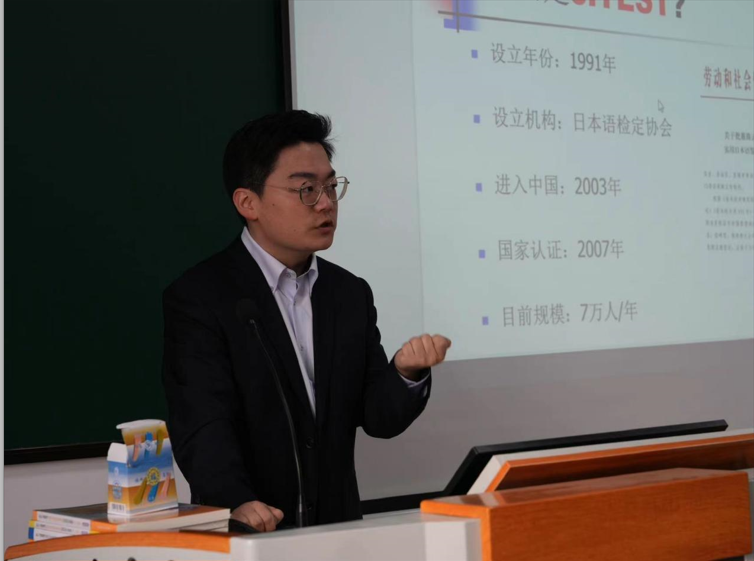 袁小卫先生对日语J.TEST考试做了简单的说明,鼓励同学们努力备考,通过考试彰显日语水平。随后,J.TEST中国事务局的王鸣晨老师对该考试做了全方位的介绍,如J.TEST考试报名流程与时间、考题类型、解题策略等。两位专家语言风趣幽默,讲座针对性强,给同学们传授了不少日语学习、J.TEST考试备考技巧与方法,使同学们更加深入的了解该考试的规则与形式。讲座还进行了赠书活动,参与互动的同学们获得考试相关书籍一份。