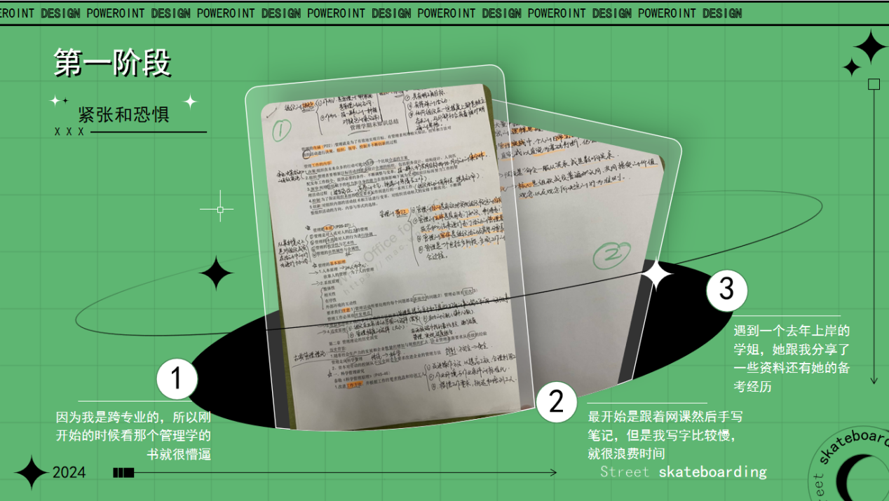 但一切并不是从一开始就顺风顺水,叶学姐将她的经历分为了三个阶段。第一阶段:跨专业的难度让她产生压力,学习进度较慢。但她为了去达成这个目标,咨询了之前的学姐,学习途中有了引路人,备考起来也少了些许的迷茫。第二阶段,逐渐掌握了方法,她将每个课程内容的笔记和题目都做了详细的整理,方便她的复习,这样的学习安排让她事半功倍。