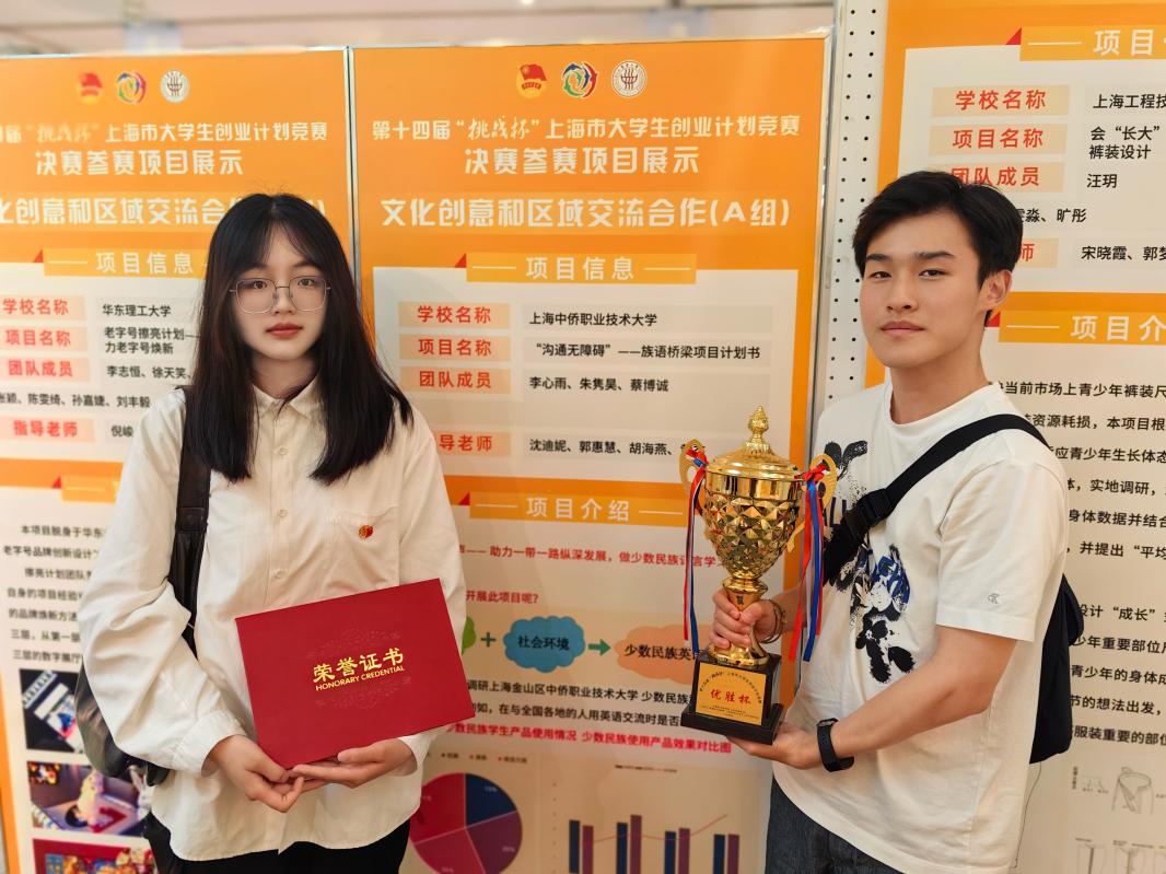 本学期末,上海市“挑战杯”第十四届大学生创业计划竞赛发布了决赛名单,英国上市365教师沈迪妮、郭惠慧、胡海燕老师以及校团委黄杰老师带领的“沟通无障碍”—— 族语桥梁项目计划书团队成功晋级市决赛。我院22级商务英语专业李心雨同学与22级商务日语朱隽昊同学于6月29日至东华大学延安路校区参加决赛答辩并最终获得上海市金奖荣誉。