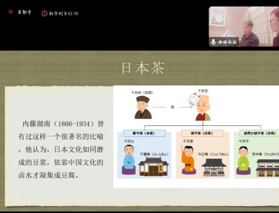 此外,日语专业还有幸邀请到了华东师范大学外语学院陆留弟教授,为我们带来一场精彩绝伦的线上讲座。陆教授以《日本人、日本语、日本茶》为题,深入简出地梳理了日本文化的起源,同时对日语的由来及发展发表了自己独到的看法。特别是身为国内研究日本茶道文化的权威,陆老师分享了许多鲜为人知的日本茶文化的特色以及与中国茶文化的异同。讲座结束后,老师们纷纷提问,如:熊老师请陆教授谈谈对中侨日语专业未来发展的几点看法。汪老师、易老师关注如何结合现代科技手段更高效的培养学生日语能力等问题。此次交流,大家都收获满满,期待未来有更多的学习机会。