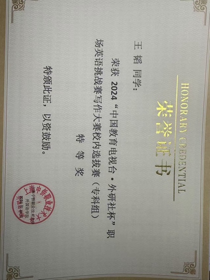 2023-2024学年荣获校一等奖学金、校社会工作三等奖学金。