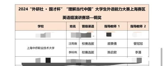9月中,四位指导教师为两位同学分别录制了一镜到底的参赛视频。11月初,在与复旦大学、上海外国语大学等沪上名校的激烈竞争中,我校学子不负众望,最终荣获铜奖的第二名和第三名,这是对他们努力和才华的最好证明。