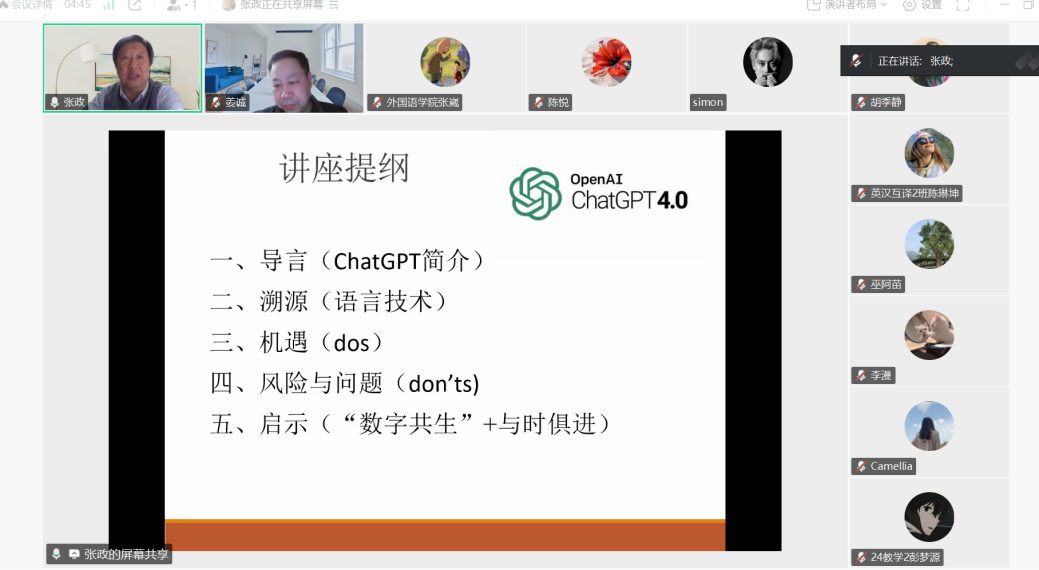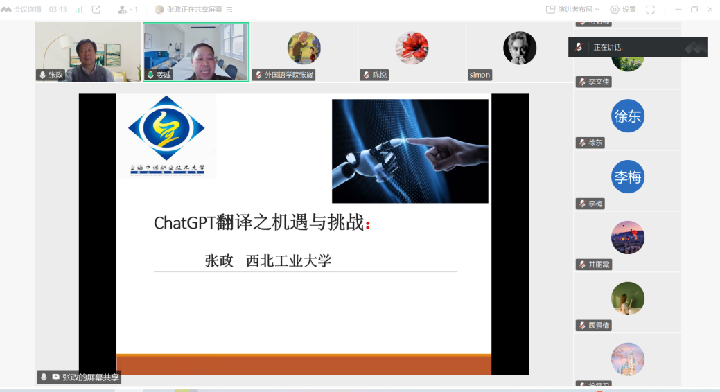 为进一步提升学院师生的科研学术能力,4月16日晚,英国上市365线上举办了一场主题为“ChatGPT给翻译带来的隐忧与疏解”的学术讲座。本次讲座特邀西北工业大学教授、博士生导师张政担任主讲嘉宾,英国上市365全体师生共同参与,讲座由姜诚副教授主持。