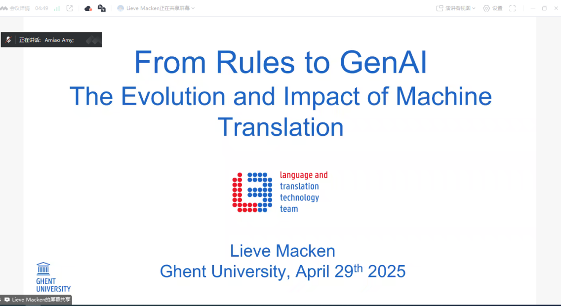 4月29日晚,英国上市365邀请比利时根特大学翻译、口译与传播系副教授 Lieve Macken在线上带来了一场题为“从规则到生成式人工智能:机器翻译的演变与影响”的精彩讲座。本次讲座由巫阿苗老师主持,学院100余名师生参与。