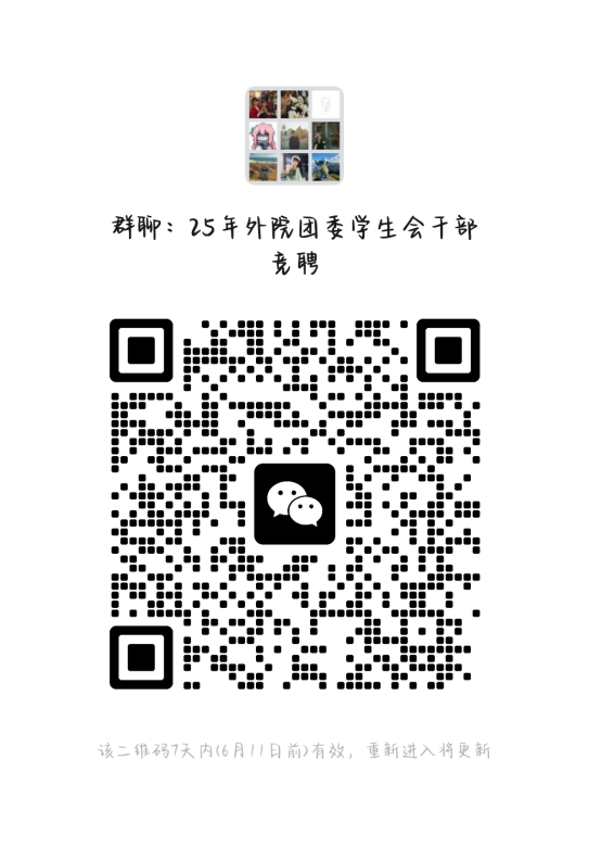 有意者请在6月10日12:00之前将申请表(扫描下图即可提取)并发送到邮箱2960123650@qq.com,并且加入竞选微信群(如下图)