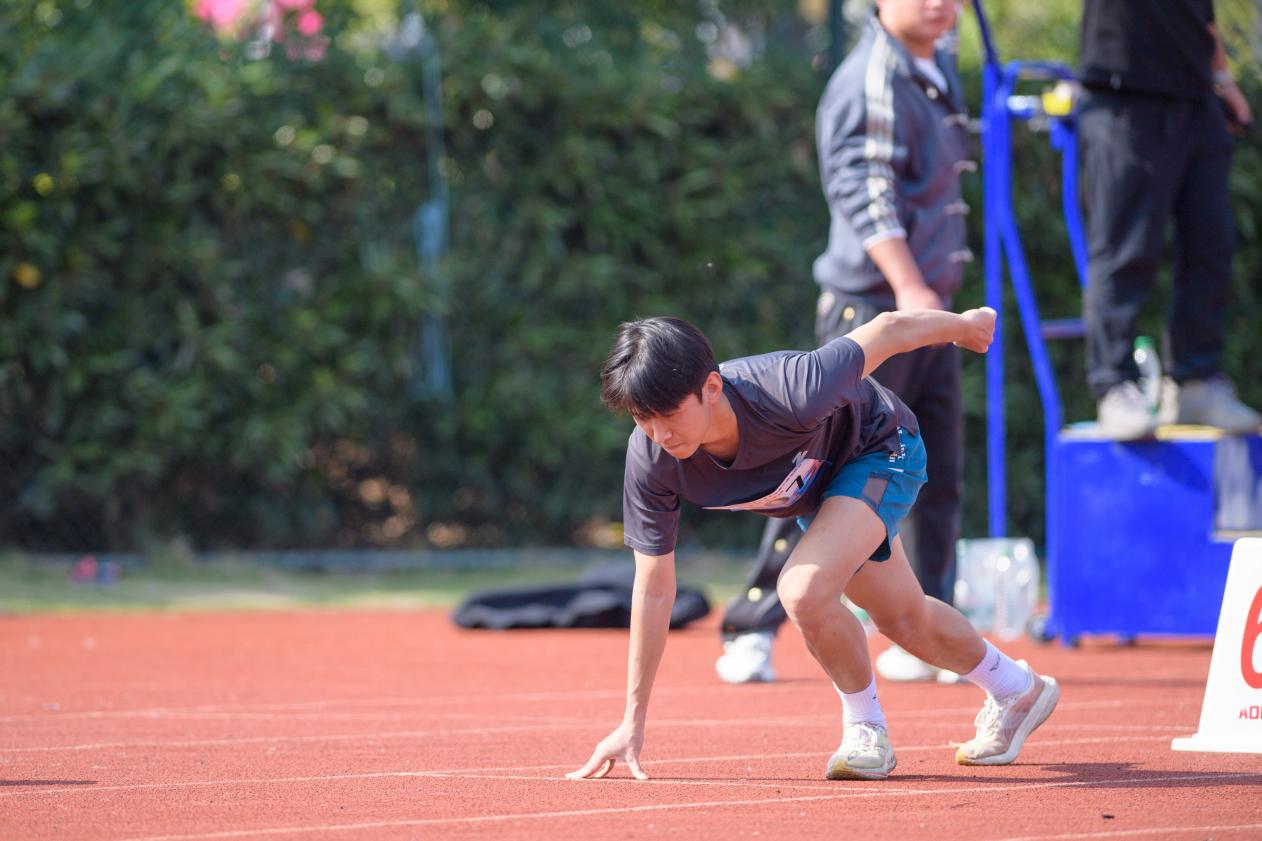 起跑区的标线旁,外院男生做完热身,立刻蹲下身调整起跑姿势。他双手撑在跑道两侧,手臂自然弯曲,身体重心向前倾斜,几乎要贴近地面。双脚前后开立,前脚掌紧紧贴住起跑线,后腿膝盖跪地,脚尖点地蓄力,运动服的下摆随着身体姿态微微下垂。他侧耳听着看台上同学中英双语的加油声,随即转过头,眼神变得格外专注,嘴角抿成一条坚定的直线。裁判发出“各就位”指令时,他深吸一口气,全身力量汇聚在双腿和双臂上,每一处线条都透着蓄势待发的锋芒,静待发令枪响的瞬间。在发令枪响不久后,外院学子就在众多选手中脱颖而出。